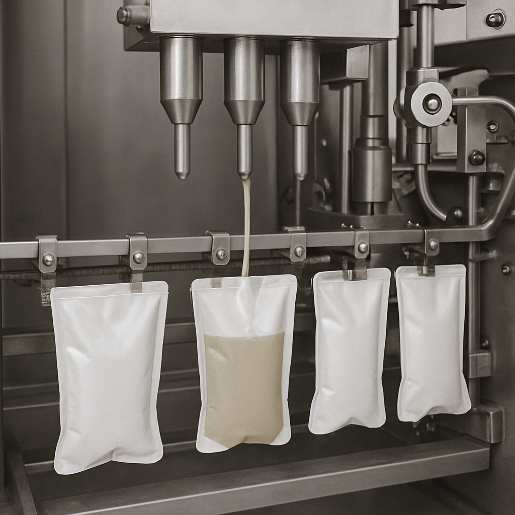 بمجرد تعقيمه، يتم نقل المنتج إلى آلة تعبئة الأكياس المعقمة، حيث يتم تعبئته في أكياس معقمة مسبقًا. تتحكم الآلة بدقة في عملية التعبئة لضمان الحجم والاتساق الدقيق. بعد ملئها، يتم إغلاق الأكياس بإحكام لمنع التلوث.